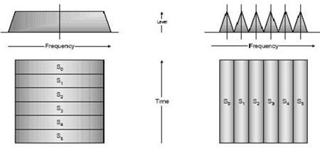 图四 单载波与OFDM符号传送方式对比
