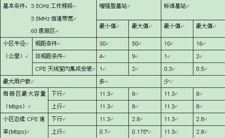 标准型与增强型基站都满足WiMax规范定义,但两者性能指标不同(详见下表)。需要强调的是,WiMax规范提供许多可选功能,这样运营商可根据不同的需求选择具有不同功能的产品,以经济的成本,建设最适用的网络。
